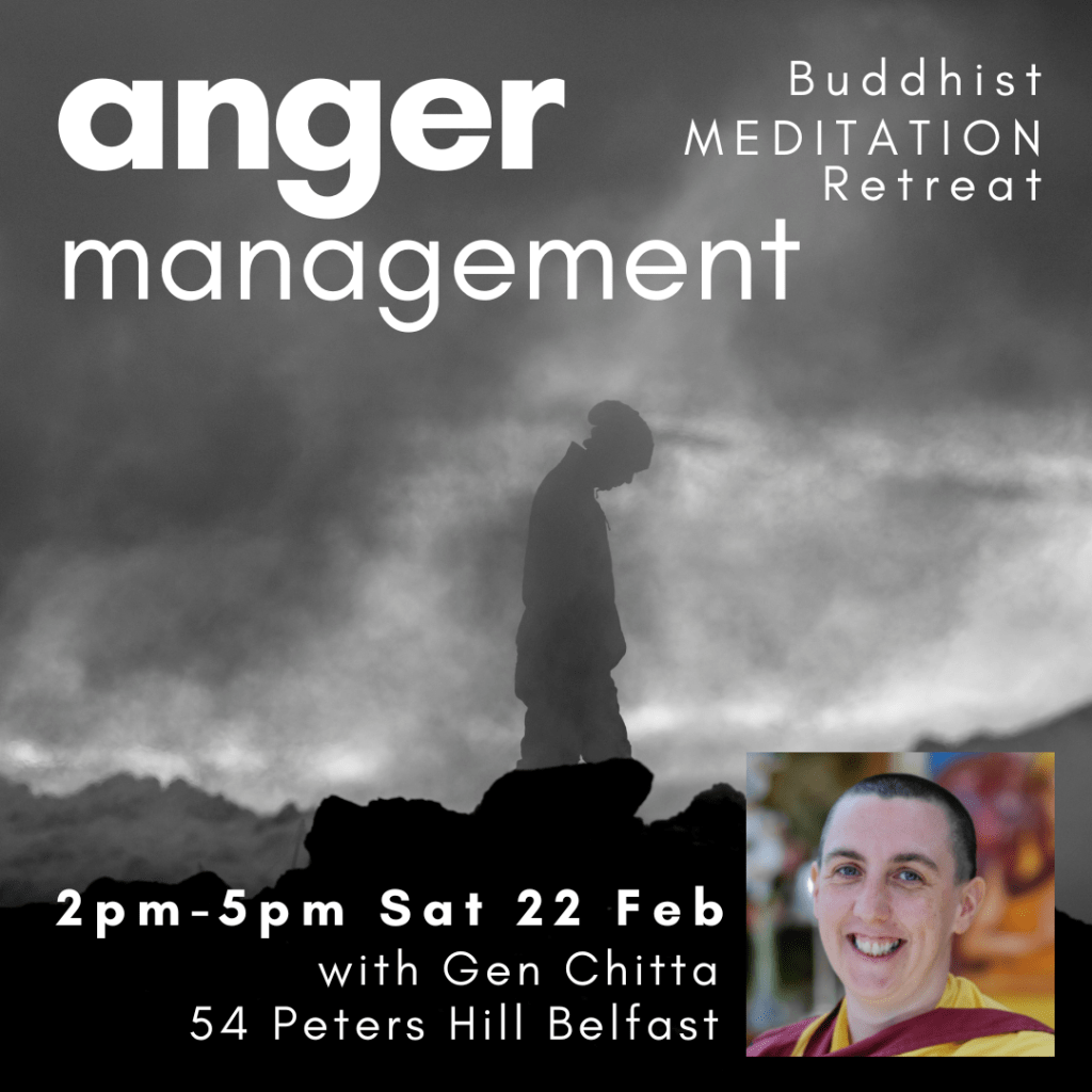 In this afternoon meditation retreat with Buddhist Nun Gen Chitta we will explore the Buddhist approach to managing an anger problem. Identifying if we have one, where it might be rooted, and how to practice different forms of acceptance and patience, through radically changing our ways of thinking in contemplation and meditation.