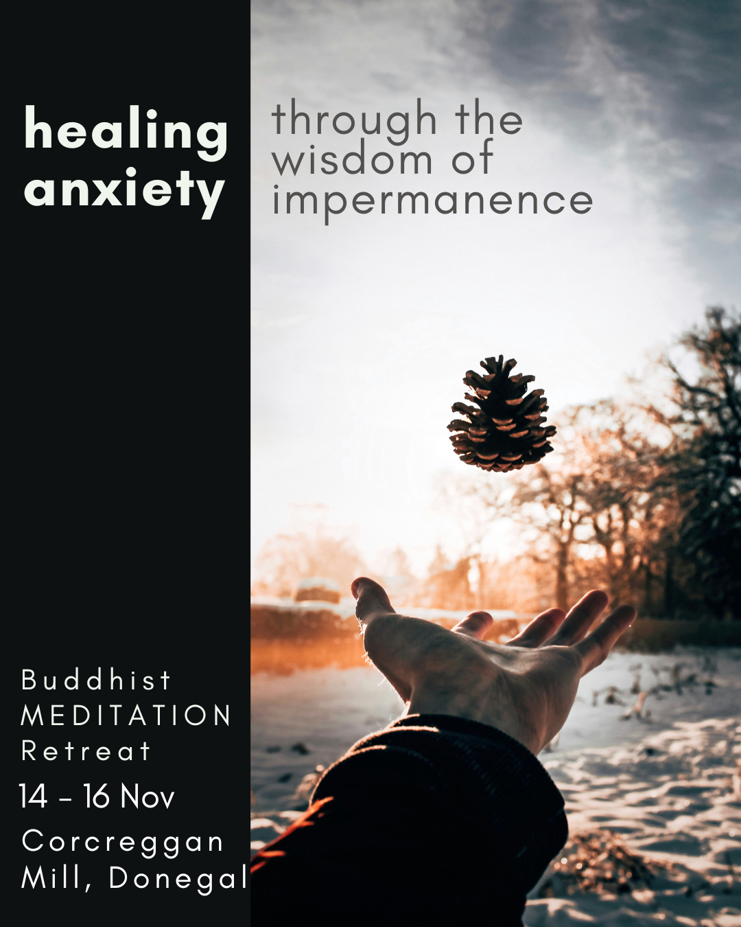 In this retreat we will explore Buddhist Meditations that reflect entering the winter of the year, a time to reflect on the Impermanence of things, including ourself. As the days grow darker we can reflect on the darker aspects of ourselves. Those that we must acknowledge to be able to abandon. We will also engage in the age-old practice of meditating on the truth of our mortality. Reflecting and meditating on the certainty of our death, and the uncertainty of its time, brings about a new lease of life. Facing and embracing these undeniable truths, which we normally hide and ignore, opens the door to the Spiritual Path, the realm of working with the mind, to make every moment of our life meaningful and liberating.